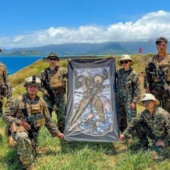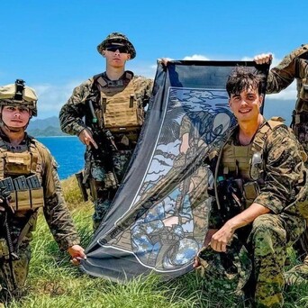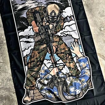图3至图6:一名曾部署在菲律宾的美国大兵,制作了一幅“枪杀解放军”的旗帜,并带到菲律宾多次拍照展示。