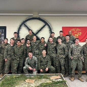 这幅旗帜模仿的汤姆·洛弗尔的画作《贝洛森林》(图7)。原作描绘的是一战贝洛森林战役时,一名美军士兵用步枪刺刀刺杀倒地的德军士兵。制作旗帜的美国大兵把背景改成了热带海岛,倒地的人则成为了解放军战士,似乎是暗示美军会在太平洋岛礁的战役中击败解放军。不过他甚至把解放军的迷彩服都画错了,可见他纯粹的自嗨,压根就不熟悉解放军。